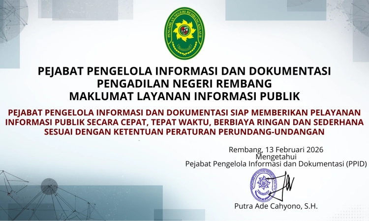 Puji syukur kehadirat Allah SWT atas terwujudnya website resmi Pengadilan Negeri Rembang yang beralamat https://www.pn-rembang.go.id. Website resmi Pengadilan Negeri Rembang ini merupakan implementasi dari Surat Keputusan Ketua Mahkamah Agung RI Nomor 144/KMA/SK/VIII/2007 tentang keterbukaan informasi diseluruh jajaran Pengadilan se-Indonesia sebagaimana diubah dan ditambah dengan Surat Keputusan Ketua Mahkamah Agung RI Nomor 1-144/KMA/SK/I/2011 tentang Pedoman Pelayanan Informasi Publik di Pengadilan.