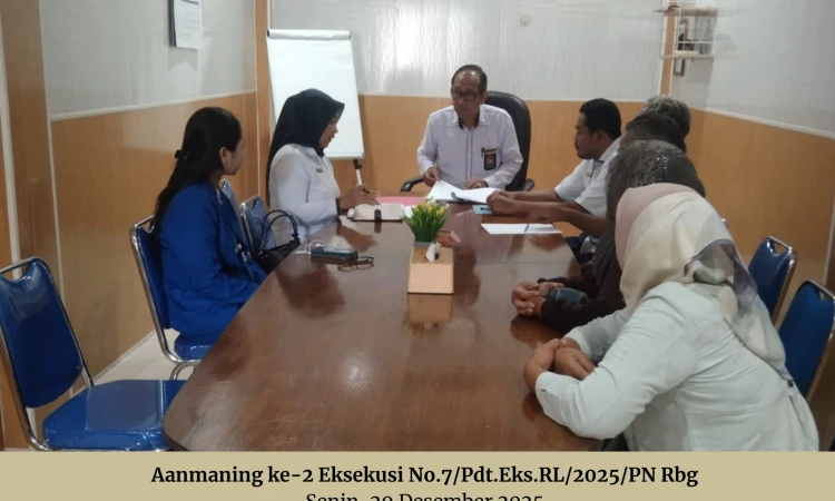 Pengadilan Negeri Rembang melaksanakan kegiatan Aanmaning ke-2 dalam rangka pelaksanaan Eksekusi perkara Nomor 7/Pdt.Eks.RL/2025/PN Rbg pada hari Senin, 29 Desember 2025. Kegiatan tersebut dilaksanakan di Ruang Mediasi Pengadilan Negeri Rembang.
