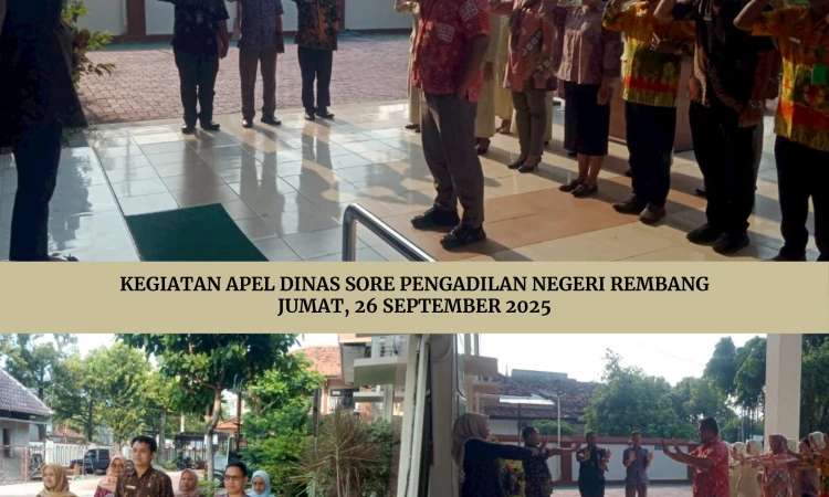 Pelaksanaan Apel Dinas Sore Pengadilan Negeri Rembang dengan Pembina apel Panitera Ibu Yulistyana Budi Suryani,S.H dan di ikuti oleh seluruh Aparatur Pengadilan Negeri Rembang