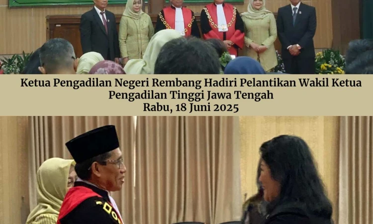 Rabu, 18 Juni 2025 – Ketua Pengadilan Negeri Rembang, Ibu Liena, S.H., M.Hum., menghadiri acara pengambilan sumpah dan pelantikan Wakil Ketua Pengadilan Tinggi Jawa Tengah, Yang Mulia Bapak Aviantara, S.H., M.Hum. Acara tersebut diselenggarakan di aula Pengadilan Tinggi Jawa Tengah. Acara berjalan dengan khidmat dan penuh nuansa kehormatan.