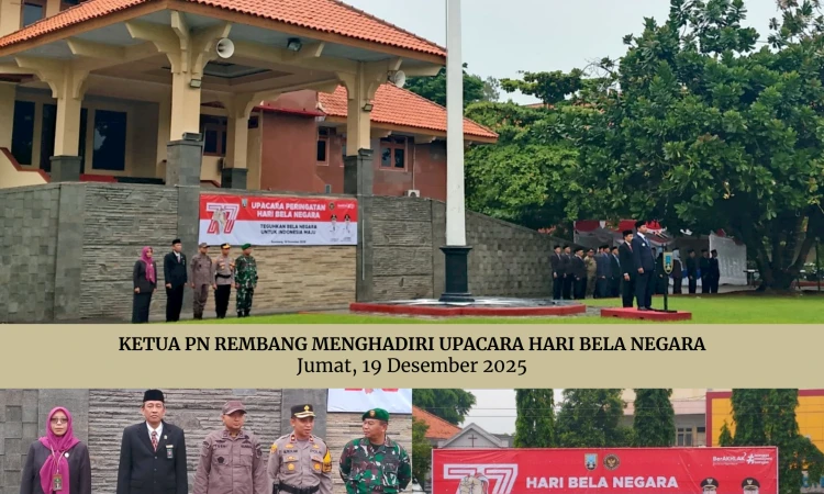 Rembang – Ketua Pengadilan Negeri Rembang menghadiri Upacara Peringatan Hari Bela Negara yang diselenggarakan pada Jumat, 19 Desember 2025, bertempat di halaman Kantor Bupati Rembang. Upacara tersebut diikuti oleh unsur Forkopimda, pimpinan instansi vertikal, TNI, Polri, aparatur sipil negara, serta berbagai elemen masyarakat.