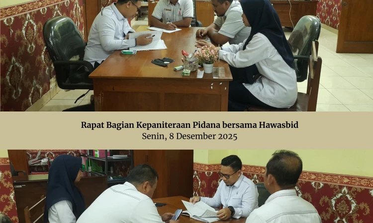 Penyelenggarakan rapat pengawasan internal pada hari ini, dipimpin oleh Hawasbid Kepaniteraan Pidana. Rapat bertujuan mengevaluasi seluruh berkas perkara dan menyiapkan data untuk pelaporan perkara akhir tahun 2025.