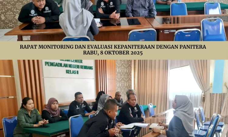 Rembang, Rabu 8 Oktober 2025 – Dalam rangka meningkatkan kinerja dan efektivitas pelayanan di bidang kepaniteraan, Pengadilan Negeri Rembang menyelenggarakan kegiatan Rapat Monitoring dan Evaluasi (Monev) Kepaniteraan yang dipimpin langsung oleh Panitera Pengadilan Negeri Rembang. Kegiatan ini bertempat di Media Center Pengadilan Negeri Rembang dan dihadiri oleh para Panitera Muda, Panitera Pengganti, serta staf kepaniteraan.