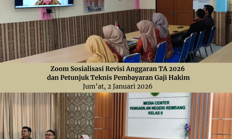 Pengadilan Negeri Rembang mengikuti kegiatan Zoom Sosialisasi Revisi Anggaran TA 2026 dan Petunjuk Teknis Pembayaran Gaji Hakim yang diselenggarakan oleh Biro Keuangan pada Jum’at, 2 Januari 2026. Kegiatan ini diikuti oleh pengelola keuangan dan para hakim guna meningkatkan pemahaman terkait mekanisme dan ketentuan pembayaran gaji hakim agar pelaksanaannya berjalan tertib, tepat waktu, serta sesuai regulasi yang berlaku.