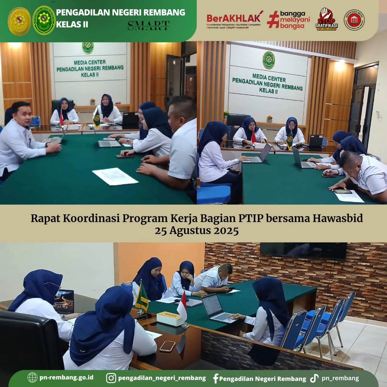 Pengadilan Negeri Rembang Kelas II melalui Rapat Koordinasi Program Kerja Bagian PTIP (Perencanaan, Teknologi Informasi, dan Pelaporan) Bersama Hawasbid melaksanakan rapat koordinasi program kerja pada Senin, 25 Agustus 2025 di Media Center PN Rembang.